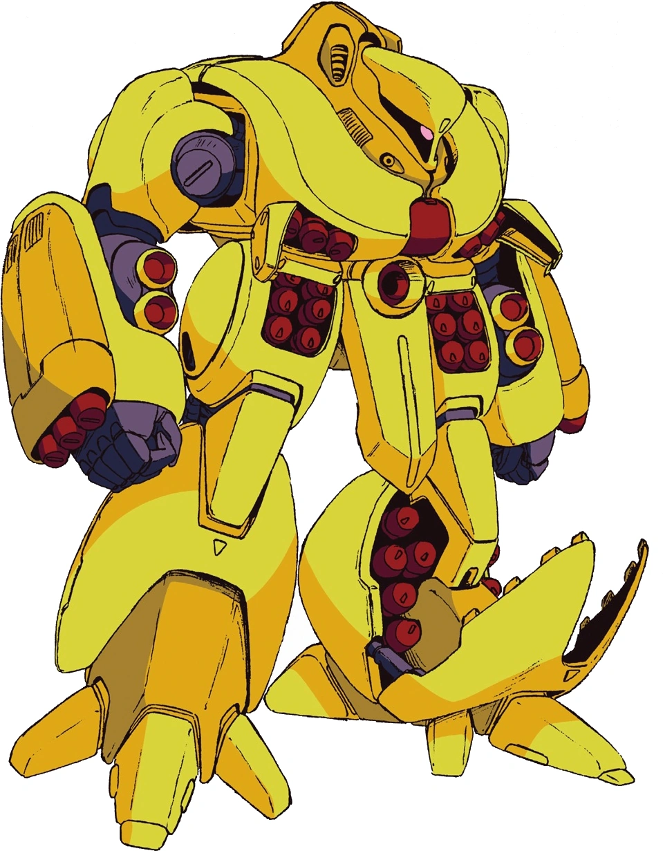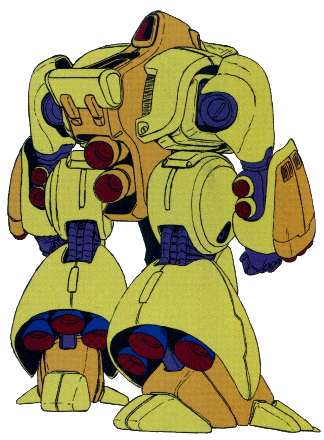 Designed as an artillery bombardment unit for support purposes, it is originally meant to work in tandem with the AMX-101 Galluss-J. The AMX-102 Zssa is notable for the large number of missiles in its stocky yellow frame. Besides these 44 missiles, it is also armed with two 30mm vulcan guns, four beam sabers and a scattering beam gun. When tested by Mashymre Cello, the suit also carries an optional shoulder missile pod. After obtaining satisfactory test results, it was put into mass production and an optional booster pod was created for it. This booster pod not only provides the suit with additional thrusters and flight ability in the atmosphere, but is also armed with two of the shoulder missile pods and two 4-tube missile pods.