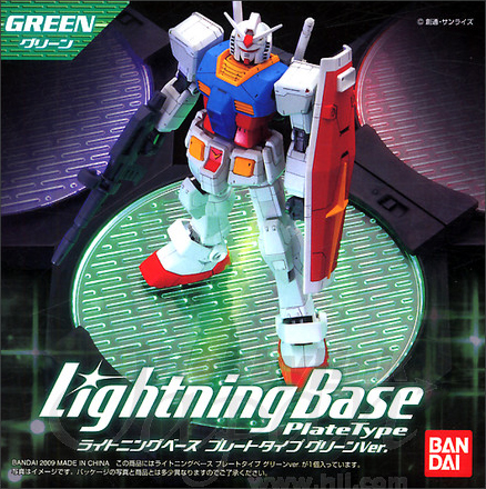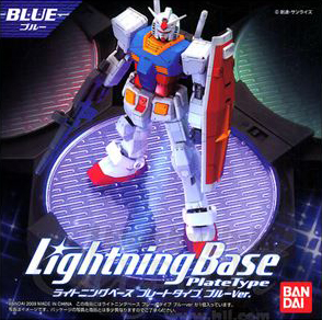 Lightning Base Plate Type (ライトニングベースプレートタイプ Raitoningu Bēsu Purēto Taipu?) is designed primarily for 1/100 or 1/144 scale Gunpla kits in standing poses. The unit consists of a black octagon base with a clear circular plate and two LED lights on opposite sides. By rotating the plate, the direction of the lights can be manipulated as desired. The base requires three AAA size batteries to operate. The Lightning Base's modular design enables it to connect to other Lightning Bases or an Action Base 1 to provide ambient lighting for aerial poses.