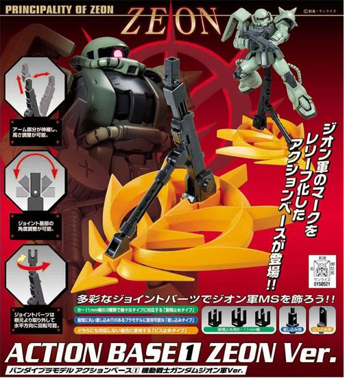 Action Base 1 Zeon Ver. | ¥800 | 2009 April | Yellow base is molded in the shape of the Zeon insignia. Base arm is shorter than the standard model. Designed for the MS-06 Zaku II and other Zeon units. |