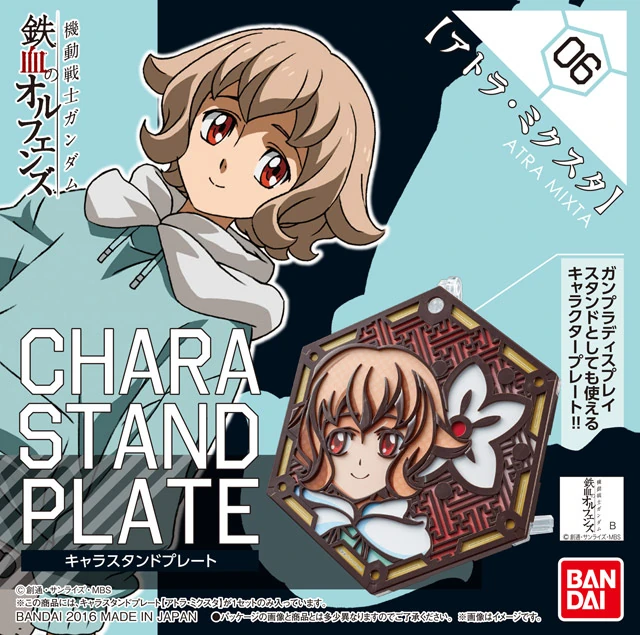 Chara Stand Plate (キャラスタンドプレート Kyara Sutando Purēto?) is designed for 1/144 scale High Grade IRON-BLOODED ORPHANS and High Grade Build Fighters kits. The hexagon shaped base consists of three layers: a clear bottom, an illustration of the character, and a black top molded in the same pattern as the illustration, giving it a stained-glass look.[8]