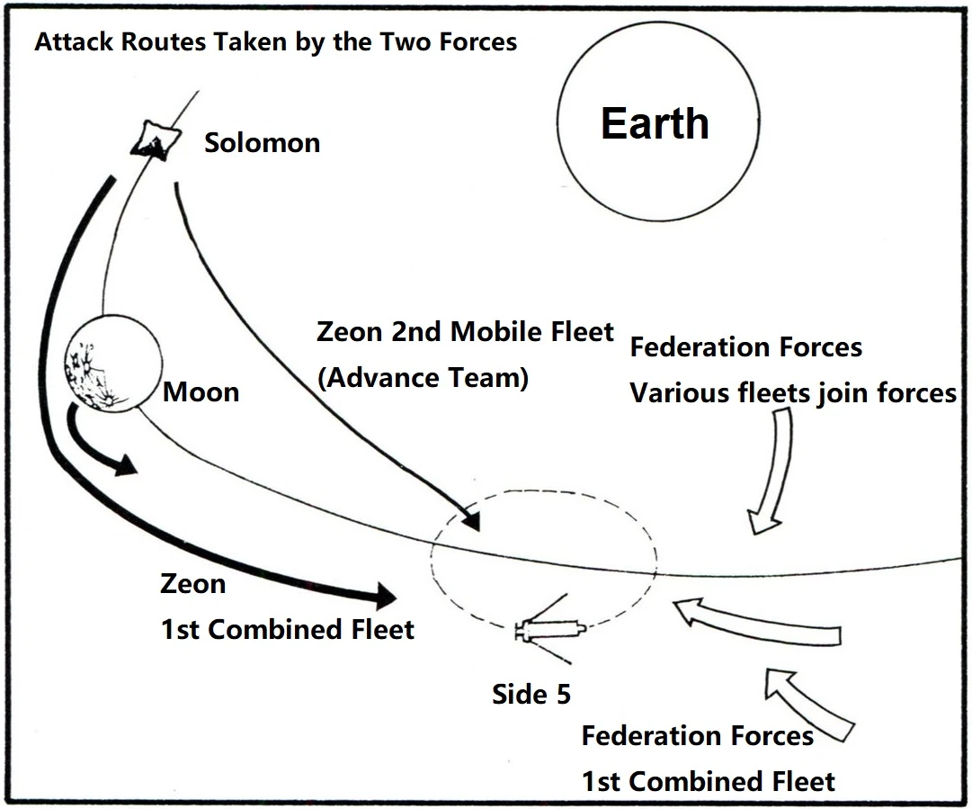 On 13 January, U.C. 0079, Vice Admiral Dozle Zabi took command of the Zeon 1st Combined Fleet at the space fortress Solomon (which was still under construction and only 70% complete) and departed for Side 5. The Combined Fleet was made up of 5 Zeon fleets, with over a hundred ships, more than half of Zeon's combat vessels. Dozle commanded the fleet from the flagship Falmel, a modified Musai-class cruiser.[1] Among the Zeon forces was the 603rd Technical Evaluation Unit, which had been ordered to field test the QCX-76A Jormungand, a prototype beam cannon designed for decisive fleet battle.[2] Zeon's 2nd Mobile Fleet departed from Solomon and headed directly for Side 5. Meanwhile, the 1st Combined Fleet took a longer route across the dark side of the moon, linking up with forces from Granada on the way.[1][3]