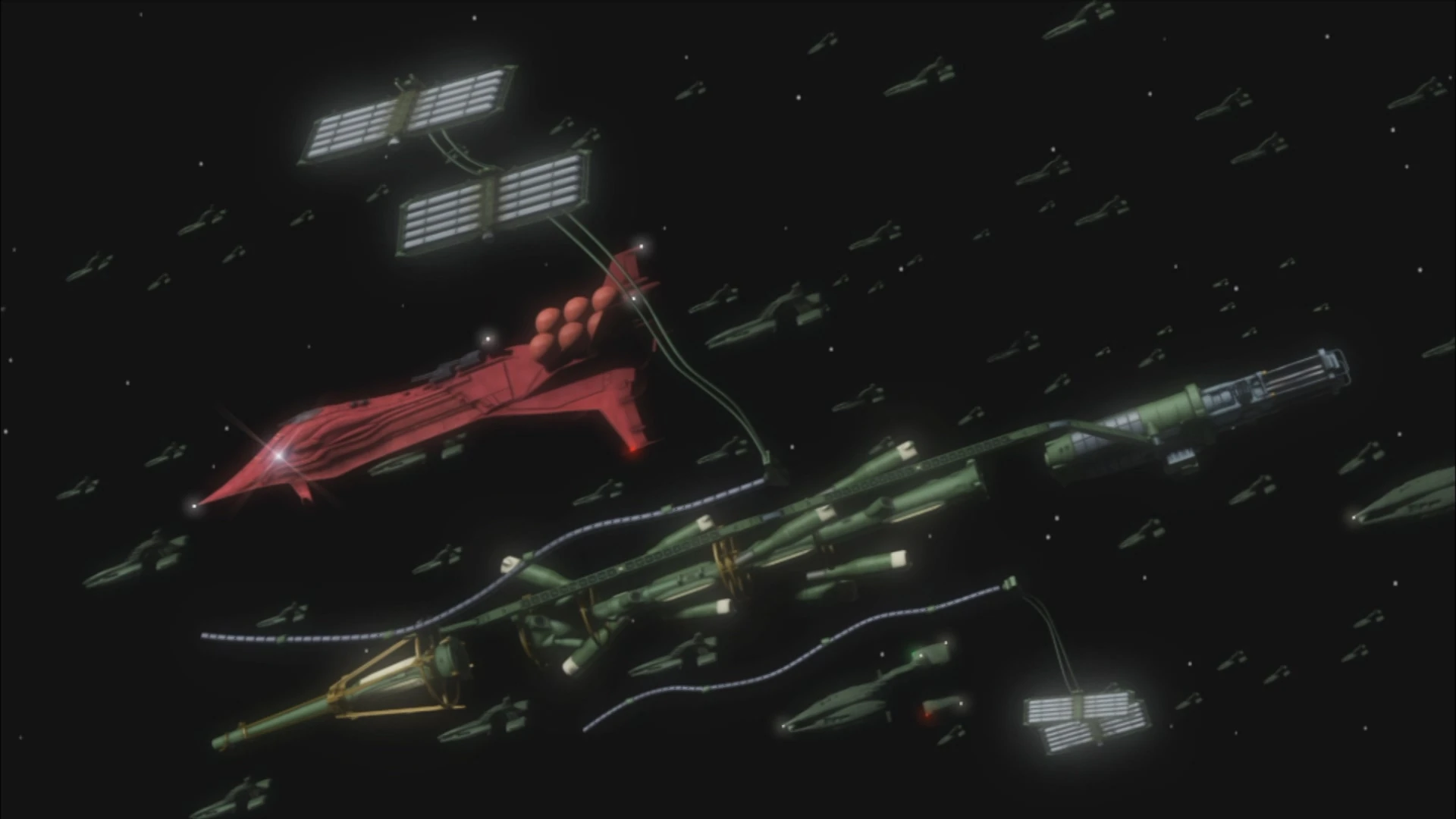 To collect observation data for the Jormungand, May and Lieutenant Hideto Washiya boarded an Observation Shuttle and flew straight ahead. At this point, the Jormungand fired a second shot, which once again missed. While May asked Hemme to wait for the data, a large number of MS-06 Zaku II appeared from behind the Zeon battle line and passed the observation shuttle from behind. Lieutenant Char Aznable's red-painted MS-06S Zaku II Commander Type stopped by the observation shuttle and used light signal to ask them to leave, telling them that a mobile suit attack was taking place as planned.[2]