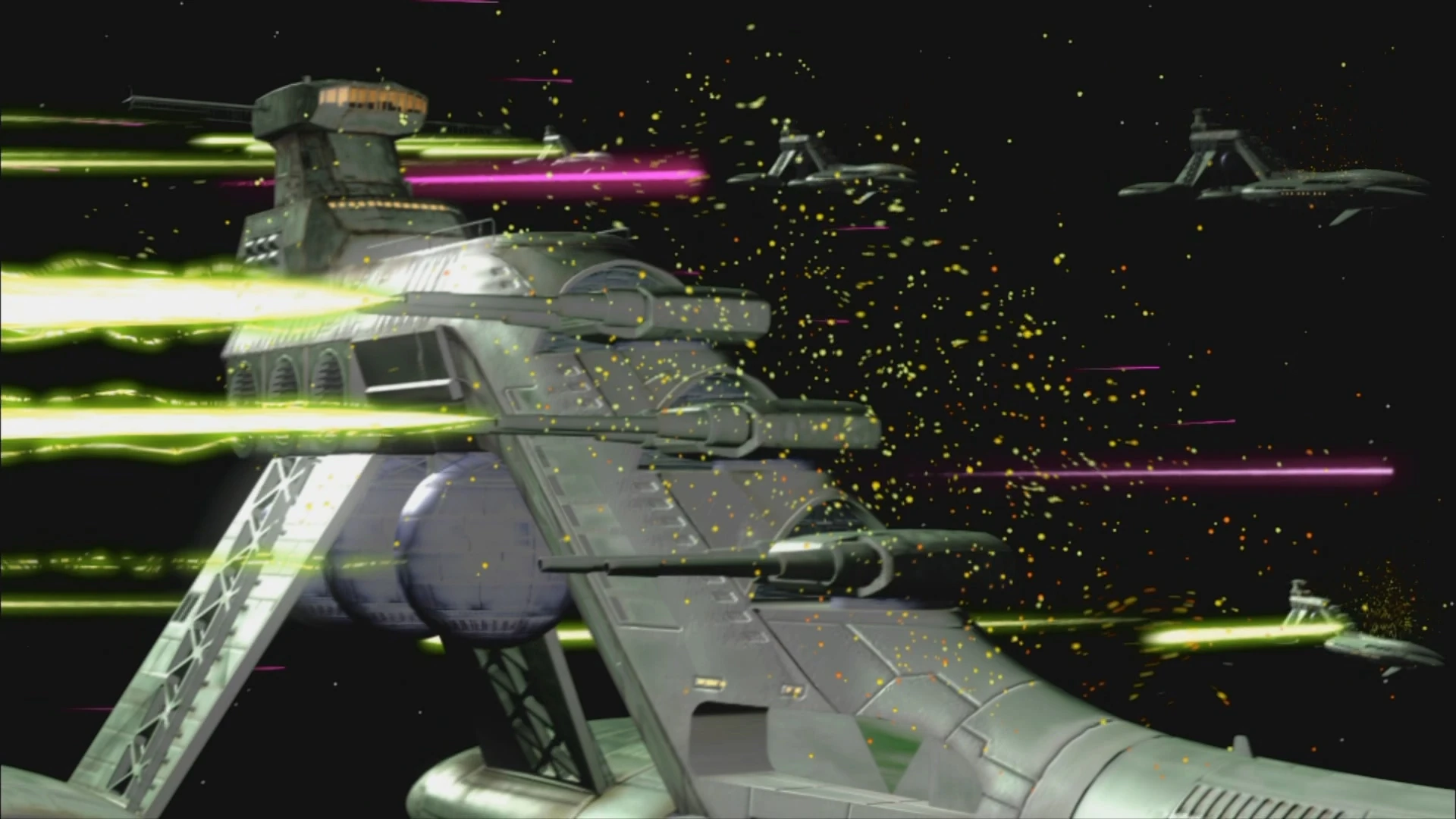 The Dozle fleet began attacking Side 5 on 15 January, at 1120 hours. At 2200 hours, from a space sector close to Side 5, the Revil fleet sighted Zeon worker ships attaching nuclear pulse engines to the Side's 11 Banchi, Wathort, and the Dozle fleet behind the worker ships. 14 minutes later, the battle commenced, with the two fleets exchanging beam cannon fire and missiles at a distance of 28,000 km.[1]