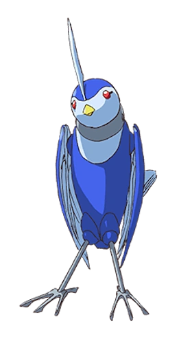 Blue is a small robot with the shape and size of a bird and has a dark and light blue color scheme.