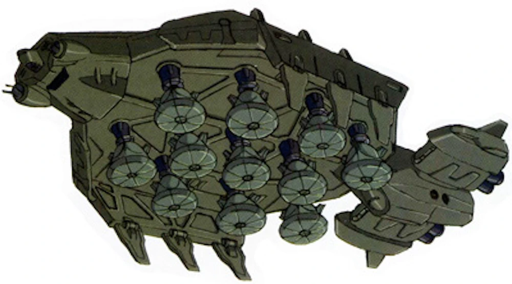 A transport ship that carries a total of 11 Descent Capsule for earth descent suspended on the underside of the hull. It can be said that it was developed for earth-descent operations that assault enemy territory from satellite orbit. Each descent capsule can carry up to four MS. The capsule's outer wall is purged with explosive bolts when it breaks through the atmosphere and reaches an altitude at which MS can be deployed.