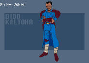 Dido Kaltoha was the commander of the African Independence Front's Blue Corps, a guerrilla organization which sought to free Africa from "European control". He rescued Neo Zeon officer Glemy Toto from the desert, and after hearing his story, offered to support Neo Zeon in exchange for Toto infiltrating the desert city of Ghardaïa. Kaltoha is mortally wounded in battle with Gundam Team's Judau Ashta. Kaltoha lies dying in the arms of Toto and asks him to keep fighting for the honor of the Blue Squadron before eventually passing away.