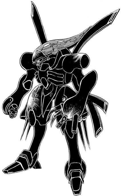 The EMS-07 Erebado was designed by the Jupiter Empire as a high performance mobile suit reserved for ace pilots and Crux Dogatie's royal guard. As with the majority of the Jupiter Empire's mobile suits the base technology of the Erebado is taken from the EMS-06 Batalla, however there are three significant differences between the two frames that indicate the Erebado's high performance profile. First, a number of shelf nozzles have been added to the Erebado's back. These long and flexible thrusters are a technology proven effective by the previous Crossbone Vanguard, and served to increase the Erebado's speed and mobility. The second noted change is the new larger head unit. Standard mobile suit designs, from the old Principality of Zeon to the Jupiter Empire, have typically placed the majority of the mobile suit's sensors in the head unit. By possessing a larger head unit the Erebado possesses a greater amount of sensors, which allows the machine to gather greater amounts of more reliable data. The third and final distinctive difference is the new left arm. The new arm unit is larger than that of the Batalla and possesses large claw-like manipulators that can smash through a Zondo Gei's armor. In addition to the increased melee power the arm is also outfitted with a built-in beam machine gun for increased ranged offense. Apart from the listed differences the Erebado and Batalla are much the same machine, meaning that the Erebado can use any equipment that the Batalla can.