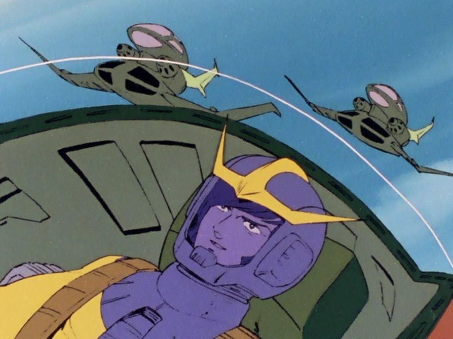 Nearby, Garma and Char are flying in the Gaw, and Garma prepares to fly out himself. Char thinks it is a bad plan, but Garma is insistent that he prove himself to his sister. He thinks that Char couldn't understand because he doesn't have any family ties. They receive warning that two fighters are nearby, which makes Garma even more determined to go out, declaring that he'll take them both down.