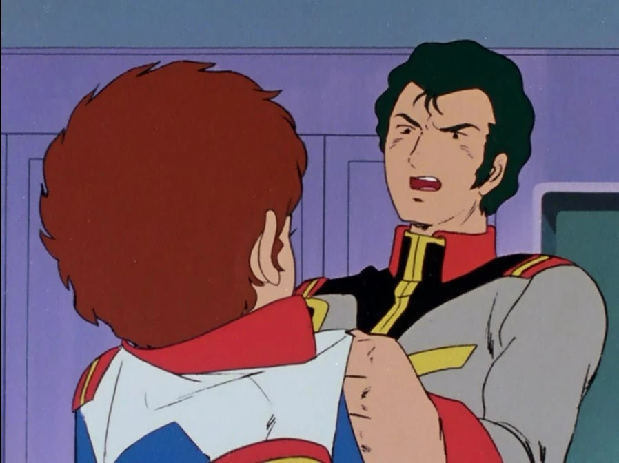 As the Guntank and Guncannon are released, Bright bursts into Amuro's room, demanding to know what he's doing. Bright grabs Amuro pulling him off the bed, and eventually punching him in the face. Amuro asks how he could hit him, and Bright calls him a spoiled brat, proclaiming that they've been catering to his every need up to now.