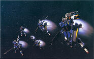 A variant of the GAT-01A1 Dagger (aka 105 Dagger) piloted by the "Moonlight Mad Dog", Morgan Chevalier. The Gunbarrel Dagger mounts the AQM/E-X04 Gunbarrel Striker as a Striker Pack, granting the suit usage of the remote controlled Wired Gunbarrels (which could only be controlled by individuals with high spatial awareness, like Morgan) and perhaps the Striker's Gatling gun, in addition to the Dagger's standard weaponry. The Gunbarrel Striker can be automated or piloted, and if it is the latter, the front section can be detached after the Striker Pack docks to the Dagger's back, which make sense as the unit's pilot is useless after the pack docks with the MS. In fact, this is what Morgan often does if the pack is delivered in battle by a pilot. As the wires of the wired gunbarrels can be easily severed during combat, a backup Gunbarrel Striker is always prepared in advance and send out when almost all the wired gunbarrels have been severed or destroyed.