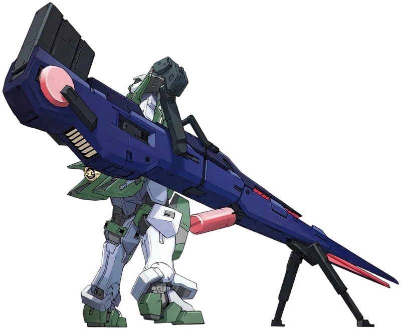 The Gundam Dynames Torpedo is the Celestial Being's GN-002 Gundam Dynames fitted with the Torpedo equipment.[1][2] It is based on the novel concept that since mobile suit is ineffective underwater, there is no need for it to enter the water.[1][2] As such, it is designed to snipe underwater targets while remaining on land.[1][2][3][4] The Dynames Torpedo has two main features: a massive, sub-aquatic sniper rifle called "DG014" that fires GN Torpedoes, and sensor systems on its face and left shoulder for better adaptation to coastal climate, underwater enemy detection as well as for control of the GN Torpedoes.[1][2][3][5] It was named “Torpedo” due to its ability to fire GN Torpedoes.[1][2][4] The Torpedo equipment weighs 6.9 metric tons, but this is under the influence of the mass reduction effect of the GN Particles produced by the GN Drive.[1][2][6] When detached from the Dynames, the equipment becomes heavier.[1][2]