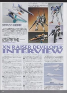 - In the original linearts of the XN Raiser drawn by Kanetake Ebikawa, a pair of Beam Guns are noted to be mounted in the tip of the two protruding parts below the support machine's central block. For reasons unknown, these Beam Guns are omitted in the official specifications of the XN Raiser.