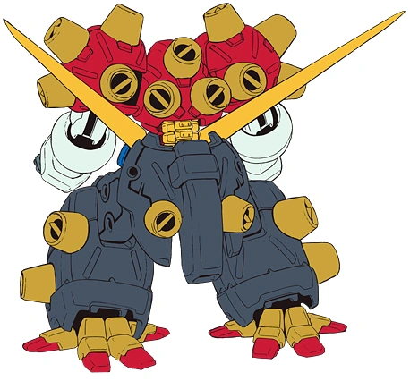 While it was equipped with the standard head vulcans and a highly destructive beam cannon in its platform head, the Devil Gundam relied more on its special abilities and physical prowess in battle. Using self-recovery, the Devil Gundam could instantly repair any damage it sustained, either restoring lost parts or replacing them with organic wiring which it could shape into other forms. With self-multiplication, the Devil Gundam could produce its own units: the Death Army, a legion of mobile suits that fought and operated in its stead and relayed information by melding with its frame to gain experience and knowledge. It later created Gundam Heads which could travel underground and were equipped with beam cannons. Lastly, with self-evolution, the Devil Gundam could change into more powerful forms, starting from its base Ultimate Gundam form, to a Mobile Fighter form, and finally to a colony-sized form, the Colony Devil Gundam. It could pass on those abilities to other humans through DG Cells from exposure; if done to Gundam Fighters, this could change their Gundams as well.