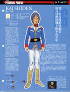 Kai is mechanically inclined and holds several large special licenses. Following training, he went into action as an RX-77-2 Guncannon pilot, though he would also pilot the RX-75 Guntank on several occasions.[1] After the end of the One Year War, he retired from the military. With the assistance of a reintegration program, he studied journalism at the University of Belfast. After working for a news agency, he became a freelance journalist. Having built a wide network of connections, his position as a neutral party allows him to function as a mediator between various factions in the Earth Sphere. He is also fairly skilled at infiltration, acting as a spy and saboteur on the AEUG's behalf during the Gryps Conflict.
