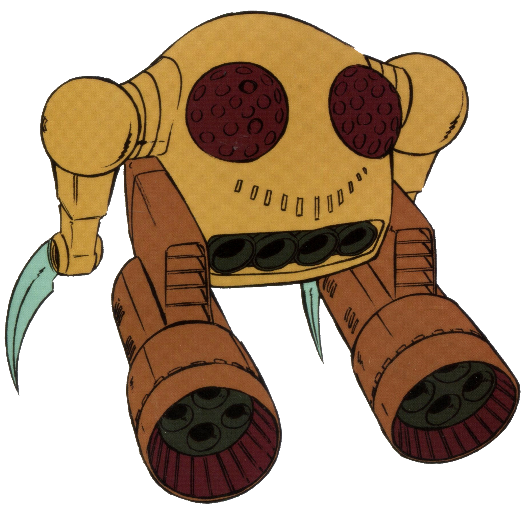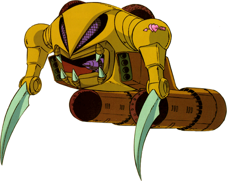 The experimental Zakrello was one of the earliest mobile armors developed by the Principality of Zeon. It had two huge thruster nacelles which gave it tremendous speed and acceleration, making it extremely fast. In terms of close-combat weapons, it mounted two giant heated blades for cutting attacks. For heavy firepower, it was equipped with a scattering mega particle cannon, which was mounted in the 'mouth' of the mobile armor. Finally, it had a pair of 4-tube missile launchers on its sides. However, despite being very fast, the MA lacked agility, making it unable to dodge attacks effectively.