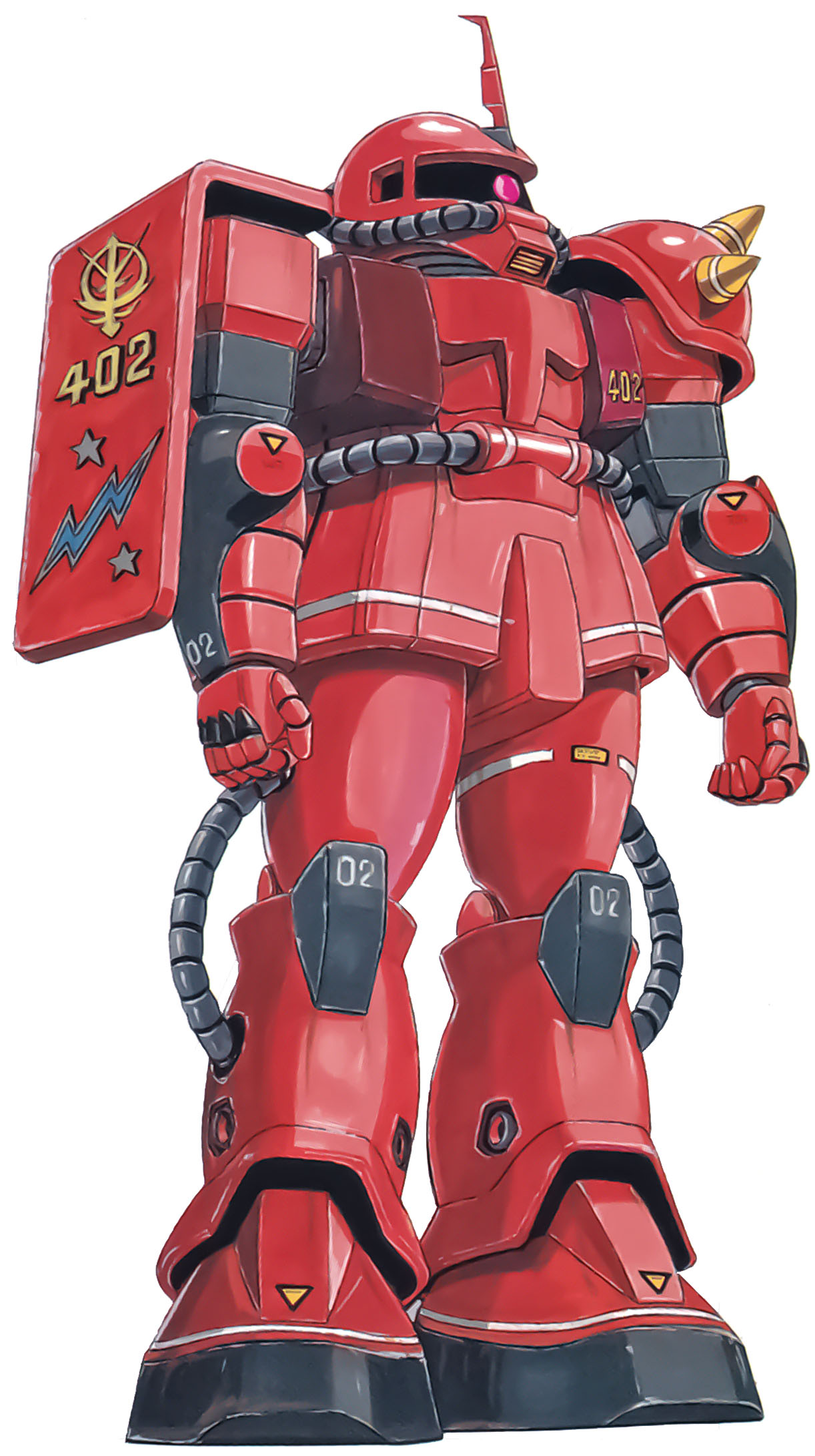 The MS-06S Zaku II Commander Type is a Mobile Suit introduced in the Mobile Suit Gundam television series. This variant looks very similar to the standard MS-06F Zaku II, so much so, that the Earth Federation can generally only tell the difference from color schemes most pilots apply to their units and the increased performance of this version.