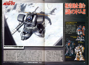 The Dom Cold Climate Type was first spotted in the northeastern part of Great Slave Lake. It was sighted by a Dragonfly pilot from the Yellowknife Base during a training flight, operating alongside two Gouf-type MS (MS-07C-3 Gouf Heavy Arms Type). The trio of mobile suits fired at the Dragonfly, but missed due to the thick foliage. The Dragonfly managed to photograph the Dom Cold Climate Type and return to base. Ten minutes later, Yellowknife Base scrambled three Fly Manta to the reported location of the mobile suits, but could not find them. Unbeknownst to the Federation pilots, the Dom Cold Climate Type had camouflaged itself and its two wing mates using its artificial snow sprayer.[1]
