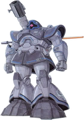 A mobile suit of the Principality of Zeon's armed forces that was locally modified from the Dom to cold-climate specifications. The backpack has been modified from the one mounted on the Prototype Dom, and contains a larger propellant tank. The Dom Cold Climate Type also has a special sprayer built in that can disperse artificial snow for camouflage, making it possible to cover the upper bodies of three MS with snow in ten minutes. Other features include additional air intakes on the shoulders, abdomen, and legs to cool the thruster engines, the elimination of the scattering beam gun on the chest, and thermal covering on the giant bazooka, all of which are designed for operation in cold climates.