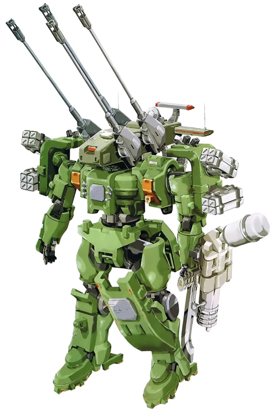 By AD 2307, the mainstay mobile suit of the Human Reform League (HRL), the Tieren Ground Type, has been in use for over a decade and a variety of variants have been developed.[1] The Tieren Antiaircraft Cannon Type is one such variant and it specializes in anti-air combat.[1][2][3] With the mainstay mobile suits of the two other blocs (the Union and the Advanced European Union) being flight type units, it is only natural for the HRL to create an anti-air mobile suit.[1][2][3]