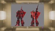 Unlike the original Zeta Gundam, Red Zeta's armor sports a heavily 'spiked' look. Equipped with the Psyco Neutralizer, its cockpit can change from a standard panoramic cockpit and linear seat by retracting the seat and manual controls. This leaves the pilot free-standing (or floating, in zero-g environments), with their head in a hollow, transparent, hemispherical device, and a number of cables attach from the seat into the back of the pilot's flight suit. In this mode, the movements of the suit follow the pilot's own movements.