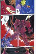 Aboard the Anaheim Electronics ship Bladewood, assistant engineer Iris Orlando and veteran test pilot Karl Schwitz were observing the battle. Suddenly, they receive a distress call from the Hardygun saying that he was under attack by a red-painted unknown unit that resembles a Zaku.