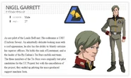 Nigel Garrett is a member of Londo Bell and is an ace MS pilot assigned to the Ra Cailum. Though generally a gentle and calm man, Garrett addresses his superiors in an arrogant manner, which is primarily due to great confidence in his own skills. Garret, along with Daryl McGuinness, and Watts Stepney, comprise the Tri-Stars Team.