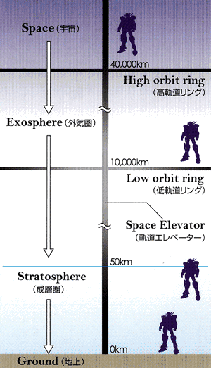 - High Orbit Station - Built into the Orbital elevator used for military purposes, probably used as a military personnel station and MS hangar. There is also a control room allowing the soldiers and the commanders to watch space operations.