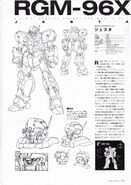 In U.C. 0096, 12 RGM-96X Jestas were assigned to the Londo Bell's flagship, Ra Cailum, for evaluation tests. During the Zeon Remnants' assault on Torrington Base that year, three Jestas piloted by Ra Cailum's "Tri-Stars Team" were deployed on Base Jabbers to assist the base's defenders in pushing back the attackers.[1] Later, when the commander of Londo Bell, Bright Noa, launched an investigation of Cheyenne Base, multiple Jestas were launched from the Ra Cailum to disable the local MS garrison.[2]