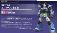 Compared to its predecessor, the RX-77-3 omitted the Core Block System and featured improved armor, reduced recoil, increased payload, rate of fire, and reloading speed. Its backpack output was also increased in an attempt to improve its mobility. However, it was said that its weight was more than its basic design could support, hindering its mobility. In addition, while it was intended to be able to operate in both group and solo combat, its solo operation capability was said to be lacking.[2][3][4]
