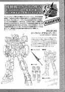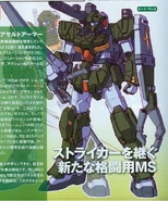 The RX-81AS Assault Armor RX-81 is a close range mobile suit equipped with additional, thick armor derived from RGM-79FP GM Striker's. When required, it can mount a drum-type backpack with seven built-in thrusters to improve its thrust.