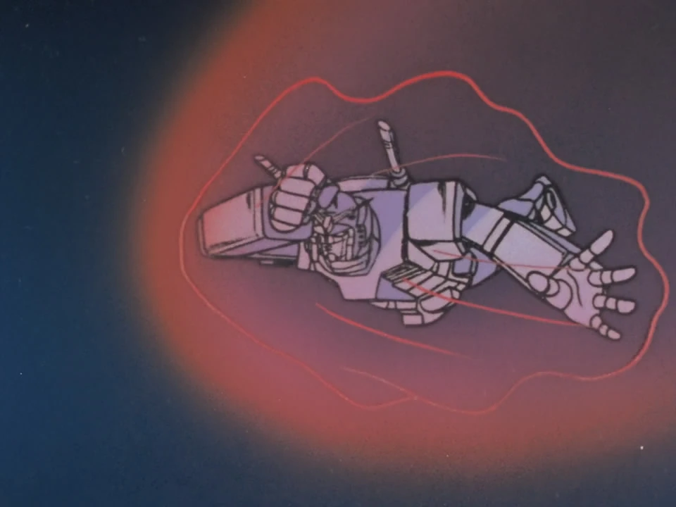 Both suits soon make it too deep into the atmosphere to return to their ships. Crown shouts to Char for help, but it is too late. Char tells him that because of him, Gundam will now burn up in reentry, so he has not died in vain. His suit burns up in the atmosphere. Meanwhile, Amuro quickly thumbs through the Gundam's manual and tries to find a way to save his life. There, he finds the necessary manoeuvres for reentry, and deploys the Gundam's heat-proof film, covering the Gundam with it. The temperature cools, and Char and Dren watch.
