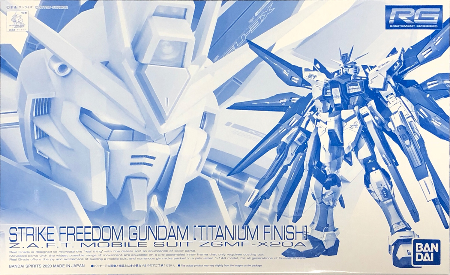 ZGMF-X20A Strike Freedom Gundam [Titanium Finish] | Mobile Suit Gundam SEED Destiny | ¥7,500 | 2020 November (Gunpla Expo 2020) / 2021 January | P-Bandai and GUNPLA EXPO TOKYO 2020 feat. GUNDAM conference exclusive metallic color variant of RG-14. | Advanced MS Joint 4 | Manual |