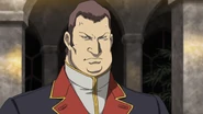 Sasro is seen when the Deikuns first view Zeon Zum Deikun's corpse, in a lineup of Munzo politicians alongside Zabi family members Gihren, Dozle and Kycilia. Later on, at the Zabi family residence, Sasro berates Kycilia for letting them escape with Ramba Ral, and violently slaps her, causing her to draw blood, to which only Dozle objects. Sasro states that the only way to deal with the Ral family is to eliminate them. He leaves with Gihren after.