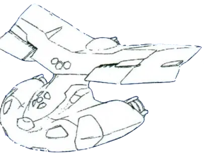 A small spacecraft for covert operations. It is used for space base and colony invasion-landing operations. It carries five airbags in the nose, three normal propulsion units in the rear and two sets of cryogenic exhaust nozzles to avoid heat source detection.