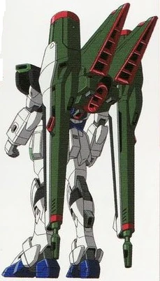 The ZGMF-X56S/γ Blast Impulse Gundam is the ZGMF-X56S Impulse Gundam equipped with the γ Blast Silhouette and is designed for long-range heavy assault and bombardment missions. As such, the Blast Silhouette is equipped with powerful range weapons in the form of two beam cannons, two rail cannons and a pair of four-tube missiles launchers. The pack also contains a pair of beam javelins for close range combat, and has additional thrusters that enable the Blast Impulse to hover over Earth surfaces such as water and improve its overall mobility. The Blast Impulse retains all of the Impulse's standard armaments, thus it can use a beam rifle and shield for ranged combat and defense respectively. The suit's VPS armor colors are different from that of the normal Impulse, and is now black, green, white and blue.